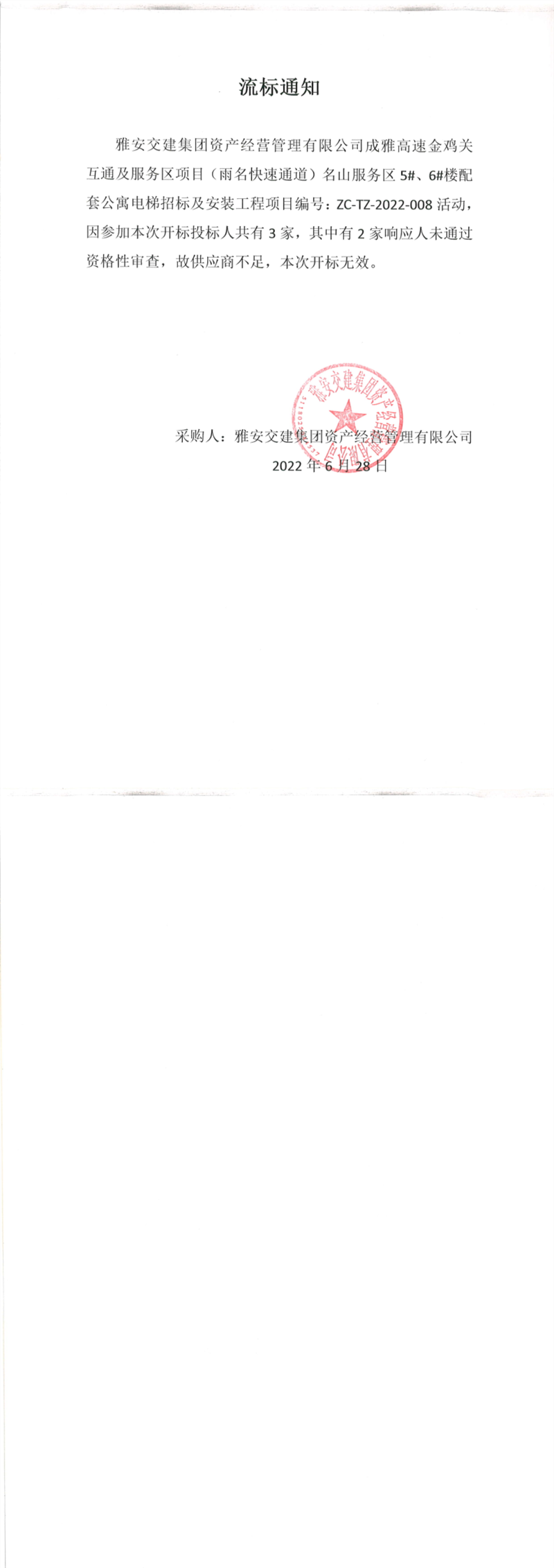雅安交建集團資產(chǎn)經(jīng)營管理有限公司成雅高速金雞關(guān)互通及服務(wù)區(qū)(雨名快速通道)名山服務(wù)區(qū)5#、6#樓配套公寓電梯招標(biāo)及安裝工程項目流標(biāo)通知