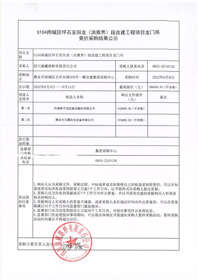 四川康藏路橋有限責任公司S104雨城區(qū)坪石至回龍(洪雅界)段改建工程項目龍門吊競價采購結(jié)果公示