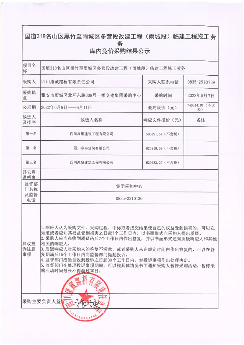四川康藏路橋有限責任公司國道318名山區(qū)黑竹至雨城區(qū)多營段改建工程(雨城段)臨建工程施工勞務庫內(nèi)競價采購結(jié)果公示