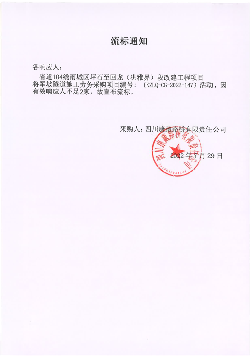 四川康藏路橋有限責(zé)任公司省道104線雨城區(qū)坪石至回龍(洪雅界)段改建工程項目將軍坡隧道施工勞采購流標通知