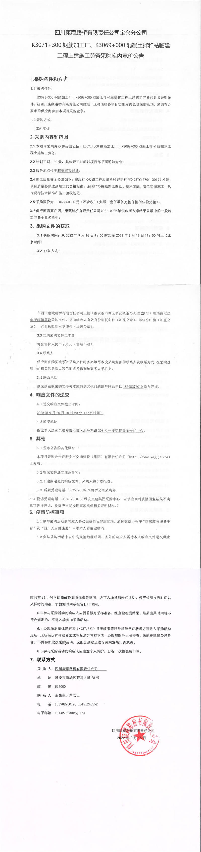 四川康藏路橋有限責(zé)任公司寶興分公司K3071+300鋼筋加工廠、K3069+000混凝土拌和站臨建工程土建施工勞務(wù)采購庫內(nèi)競價公告