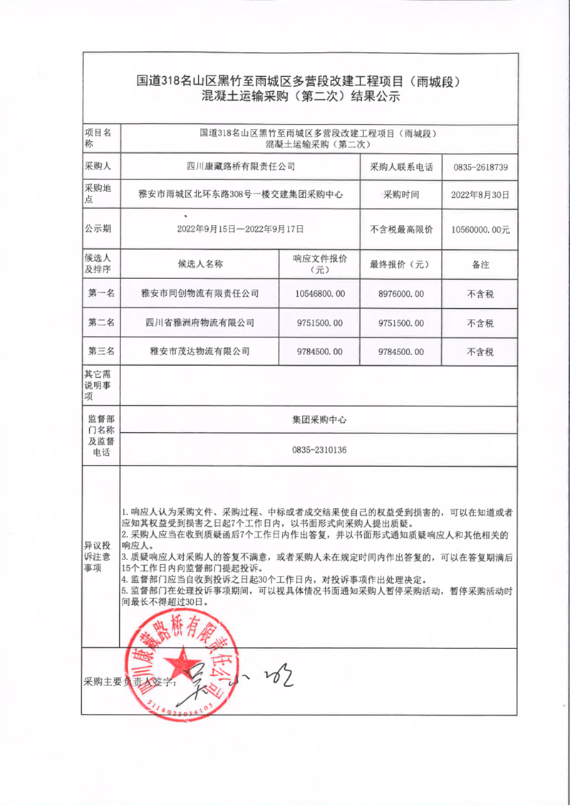 四川康藏路橋有限責(zé)任公司國(guó)道318名山區(qū)黑竹至雨城區(qū)多營(yíng)段改建工程項(xiàng)目(雨城段)混凝土運(yùn)輸采購(gòu)(第二次)結(jié)果公示