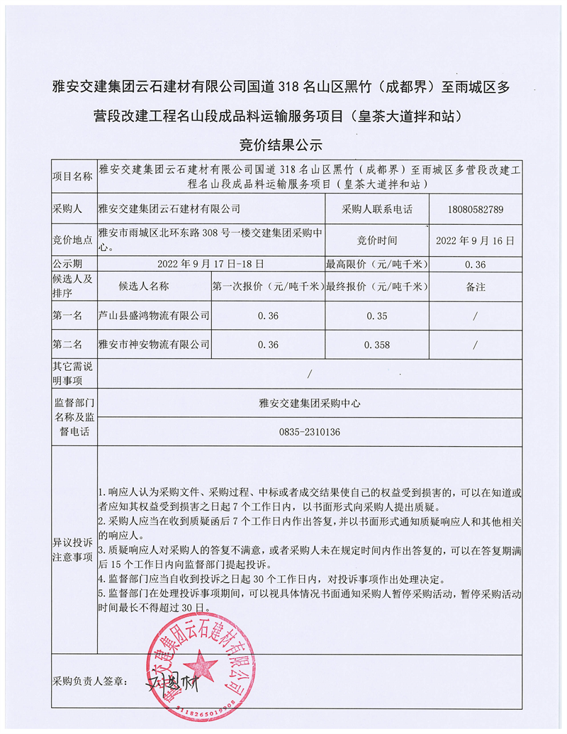 雅安交建集團(tuán)云石建材有限公司國道318名山區(qū)黑竹(成都界)至雨城區(qū)多營段改建工程雨城段成品料運輸服務(wù)項目(皇茶大道拌和站)競價結(jié)果公示