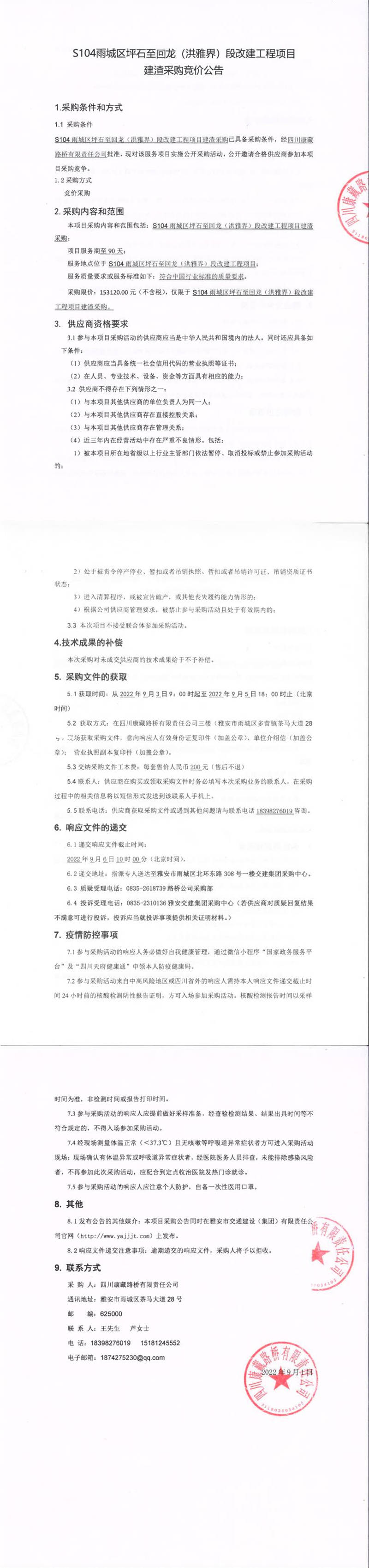 四川康藏路橋有限責(zé)任公司S104雨城區(qū)坪石至回龍(洪雅界)段改建工程項(xiàng)目建渣采購競價公告