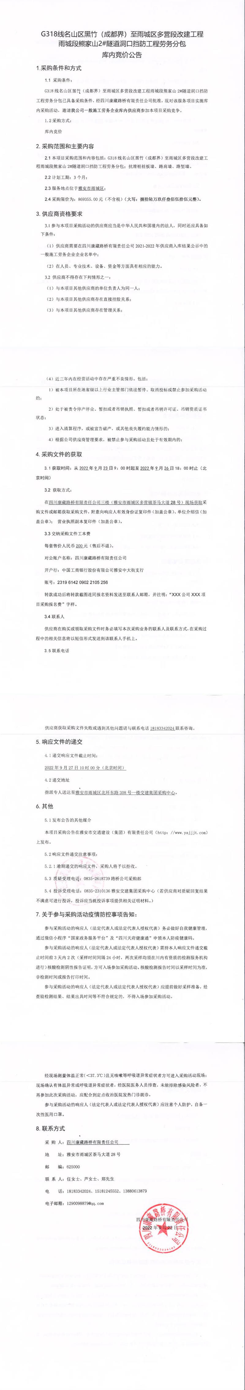 四川康藏路橋有限責任公司G318線名山區(qū)黑竹(成都界)至雨城區(qū)多營段改建工程雨城段熊家山2#隧道洞口擋防工程勞務分包庫內競價公告