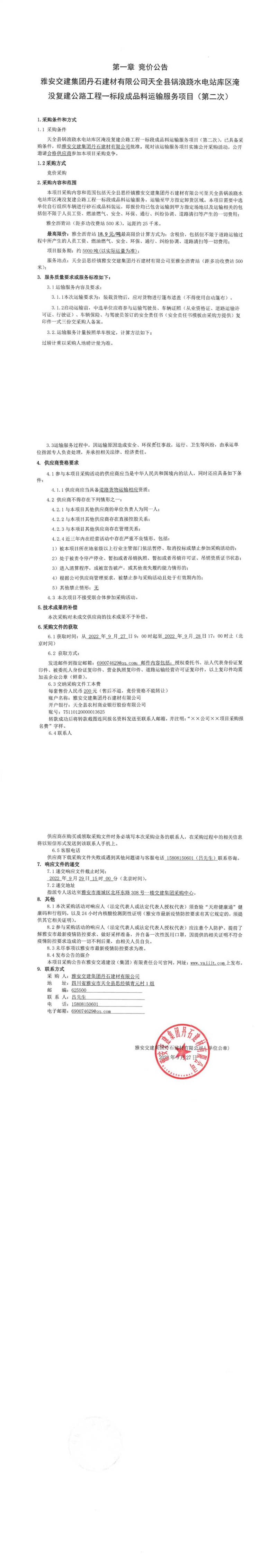 雅安交建集團(tuán)丹石建材有限公司天全縣鍋浪蹺水電站庫區(qū)淹沒復(fù)建公路工程一標(biāo)段成品料運(yùn)輸服務(wù)項(xiàng)目(第二次)競價(jià)公告