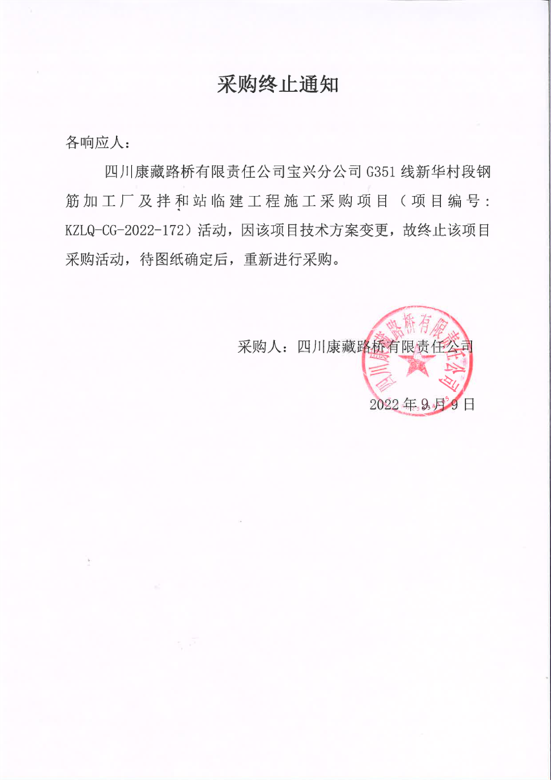 四川康藏路橋有限責(zé)任公司寶興分公司G351線新華村段鋼筋加工廠及拌合站臨建工程施工采購(gòu)項(xiàng)目采購(gòu)終止通知