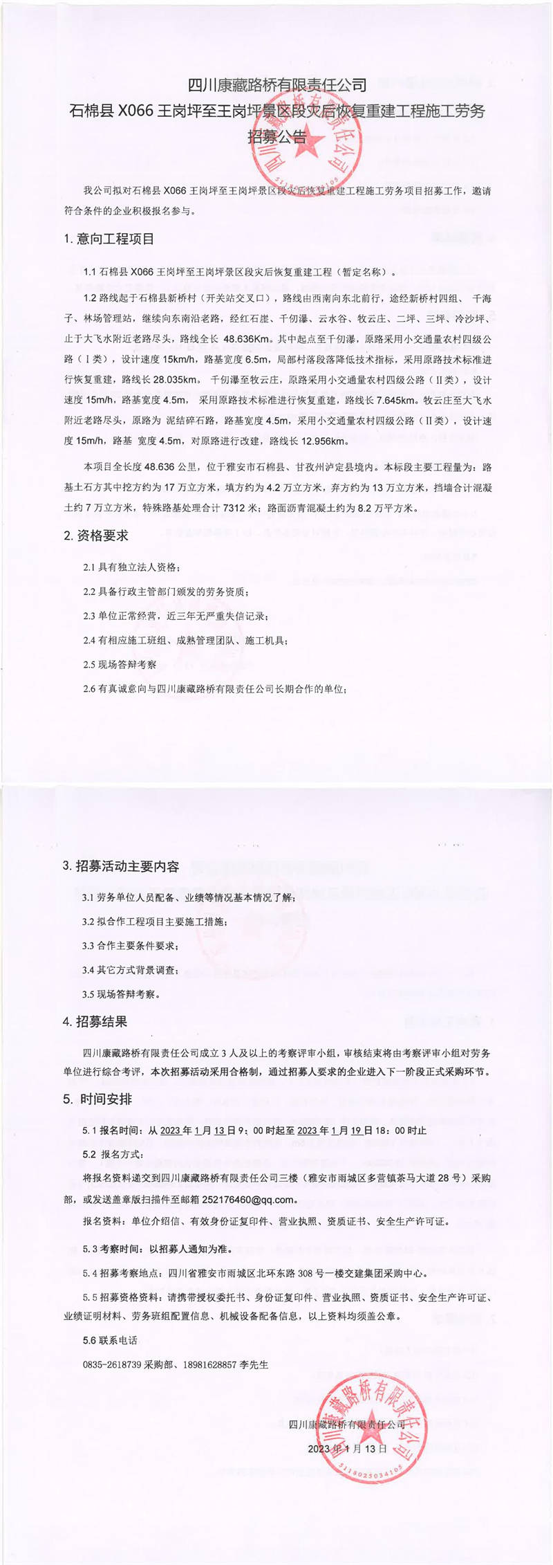 四川康藏路橋有限責(zé)任公司石棉縣X066王崗坪至王崗坪景區(qū)段災(zāi)后恢復(fù)重建工程施工勞務(wù)招募公告