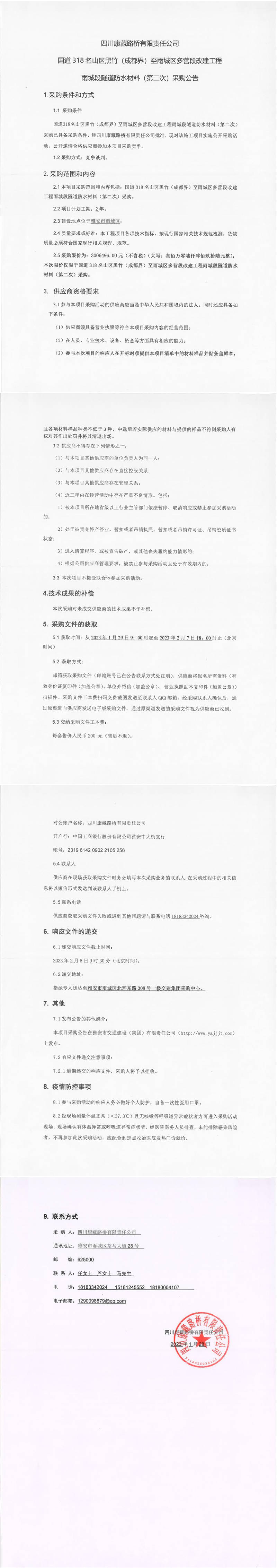 四川康藏路橋有限責(zé)任公司國(guó)道318名山區(qū)黑竹(成都界)至雨城區(qū)多營(yíng)段改建工程雨城段隧道防水材料(第二次)采購公告