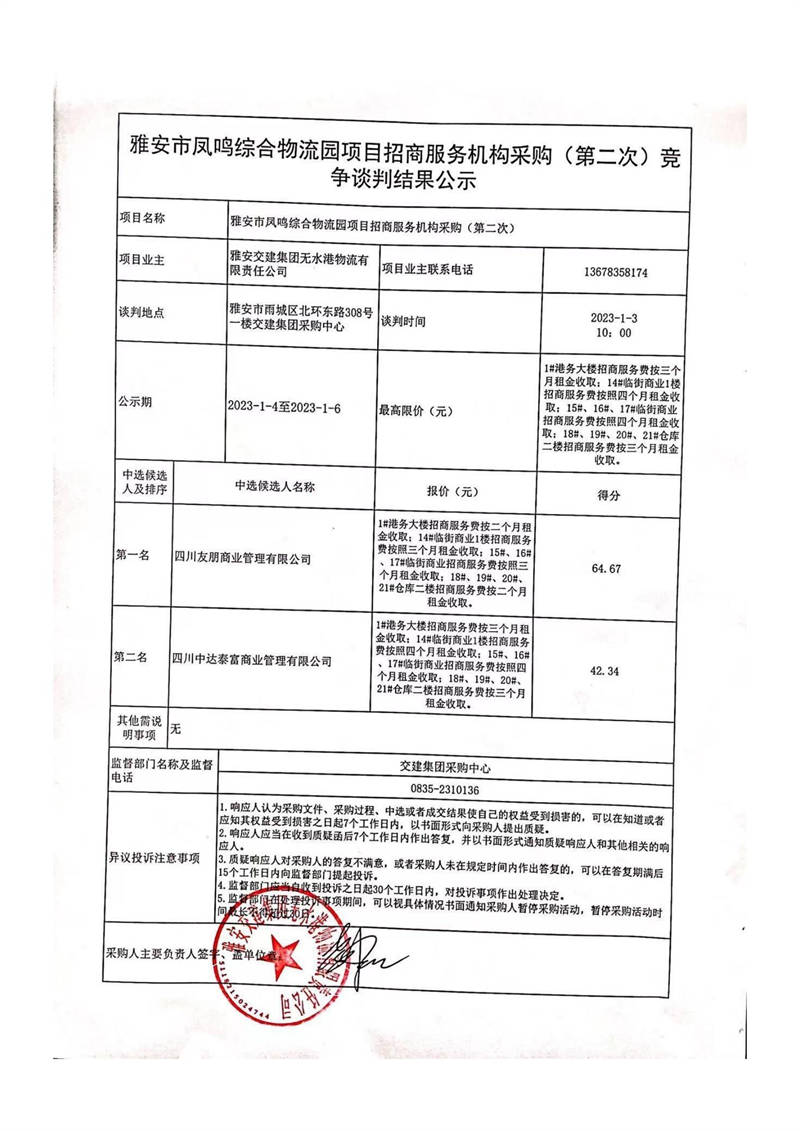 雅安交建集團(tuán)無水港物流有限責(zé)任公司雅安市鳳鳴綜合物流園項目招商服務(wù)機(jī)構(gòu)采購(第二次)競爭談判結(jié)果公示