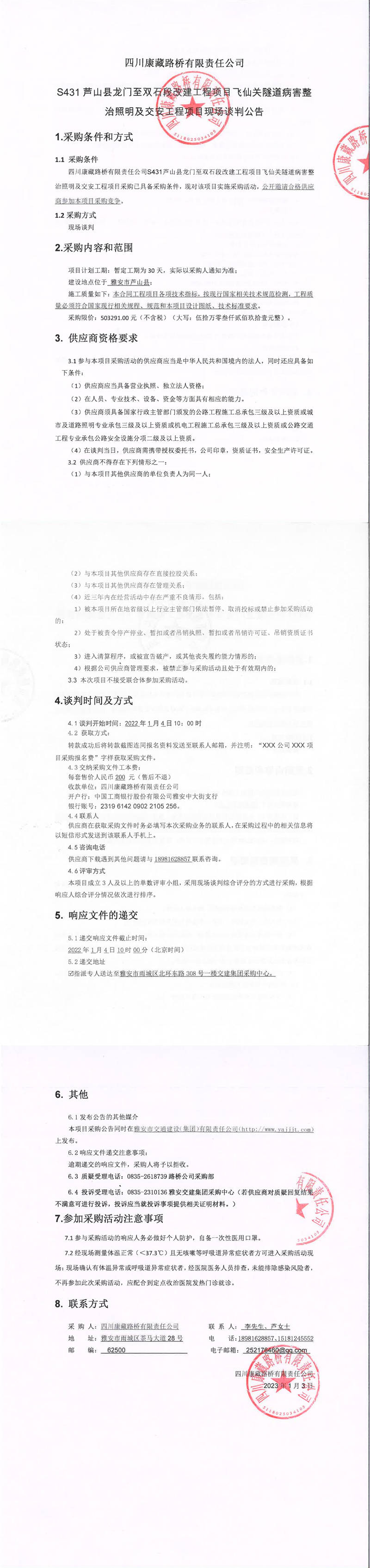 四川康藏路橋有限責(zé)任公司S431蘆山縣龍門至雙石段改建工程項(xiàng)目飛仙關(guān)隧道病害整治照明及交安工程項(xiàng)目現(xiàn)場談判公告