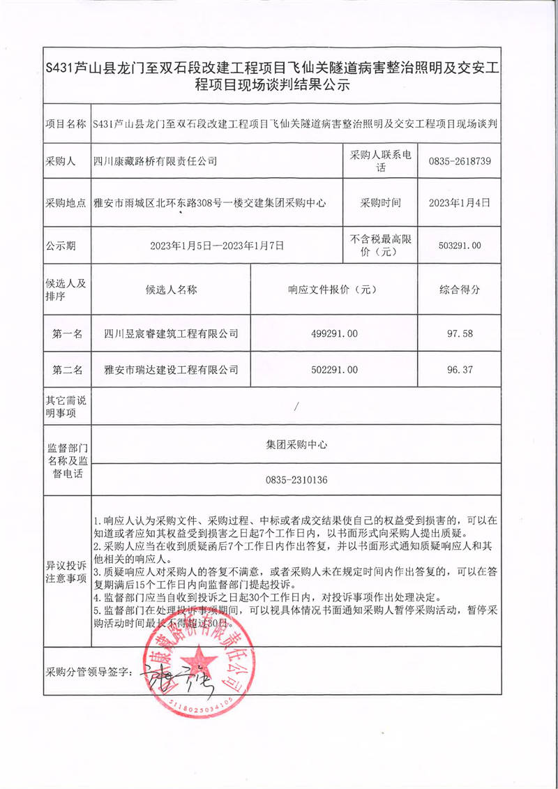 四川康藏路橋有限責任公司S431蘆山縣龍門至雙石段改建工程項目飛仙關隧道病害整治照明及交安工程項目現(xiàn)場談判結果公示