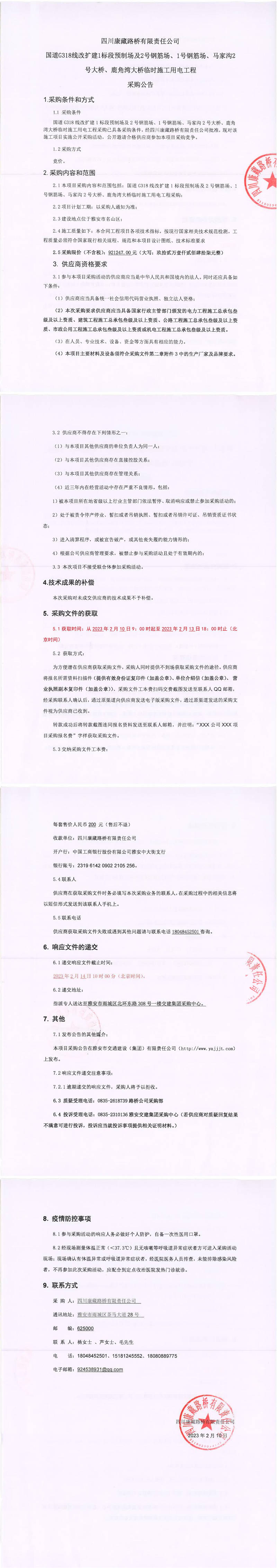 四川康藏路橋有限責(zé)任公司國道G318線改擴(kuò)建1標(biāo)段預(yù)制場(chǎng)及2號(hào)鋼筋場(chǎng)、1號(hào)鋼筋場(chǎng)、馬家溝2號(hào)大橋、鹿角灣大橋臨時(shí)施工用電工程采購公告
