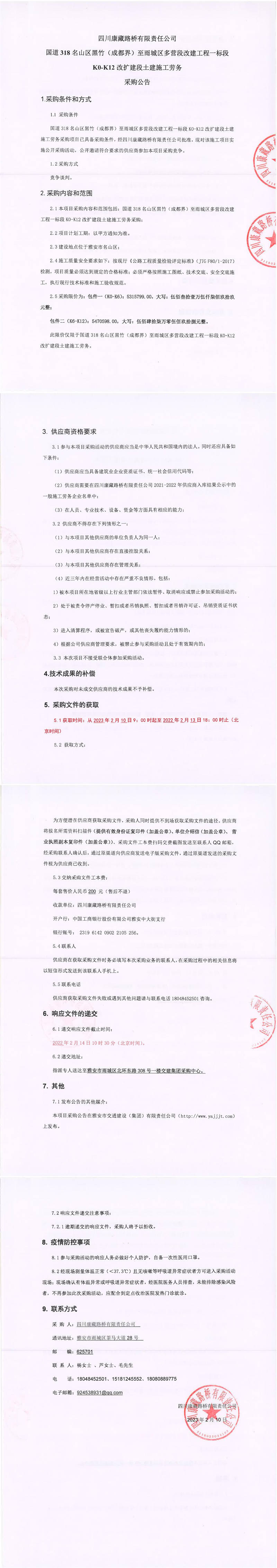 四川康藏路橋有限責(zé)任公司國道318名山區(qū)黑竹(成都界)至雨城區(qū)多營段改建工程一標(biāo)段K0-K12改擴建段土建施工勞務(wù)采購公告
