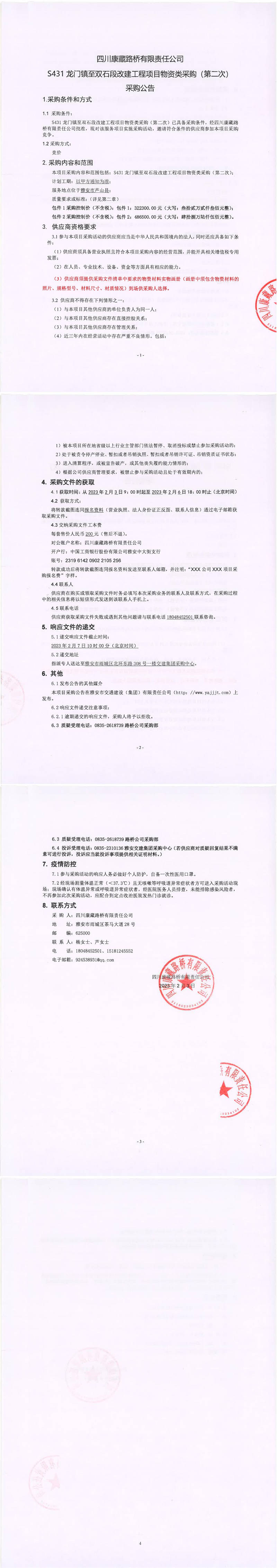 四川康藏路橋有限責(zé)任公司S431龍門鎮(zhèn)至雙石段改建工程項目物資類采購(第二次)采購公告