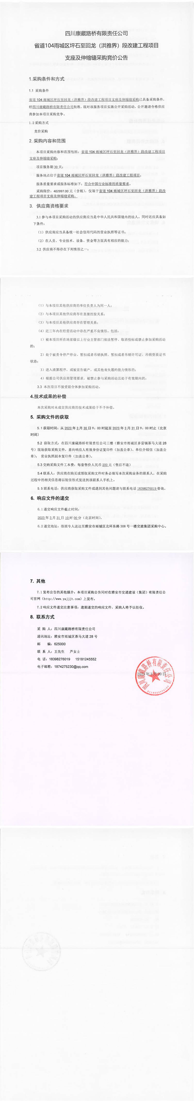 四川康藏路橋有限責任公司省道104雨城區(qū)坪石至回龍(洪雅界)段改建工程項目支座及伸縮縫采購競價公告