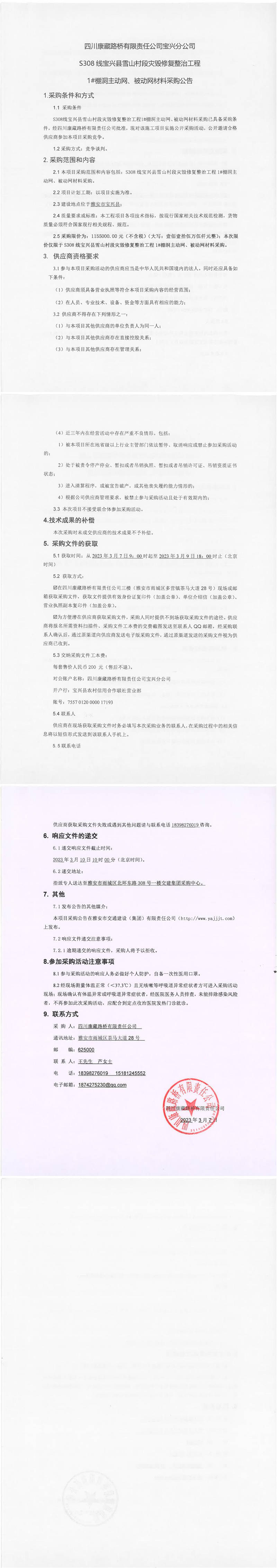 四川康藏路橋有限責任公司寶興分公司S308線寶興縣雪山村段災(zāi)毀修復整治工程1#棚洞主動網(wǎng)、被動網(wǎng)材料采購公告