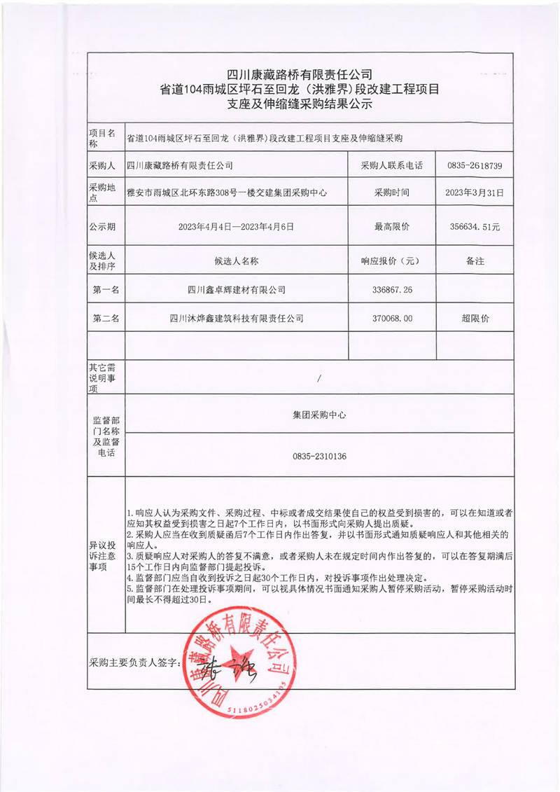四川康藏路橋有限責(zé)任公司省道104雨城區(qū)坪石至回龍(洪雅界)段改建工程項目支座及伸縮縫采購結(jié)果公示