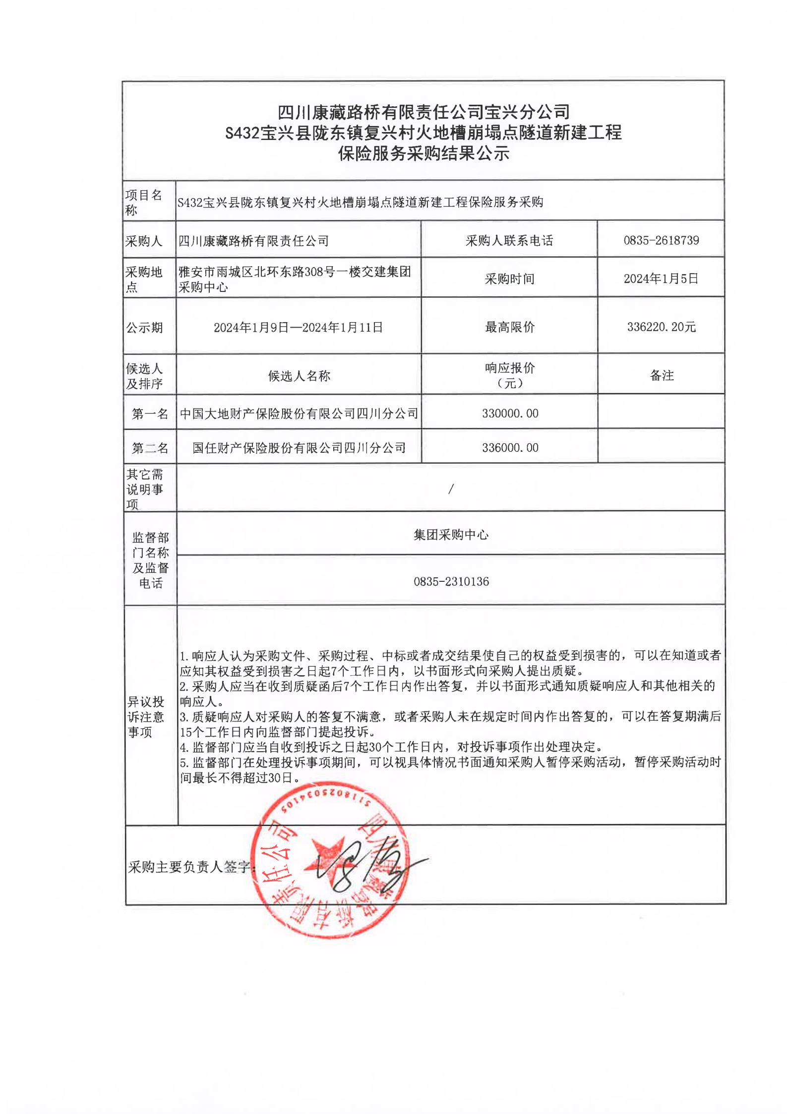 四川康藏路橋有限責(zé)任公司S432寶興縣隴東鎮(zhèn)復(fù)興村火地槽崩塌點(diǎn)隧道新建工程保險(xiǎn)服務(wù)采購結(jié)果公示