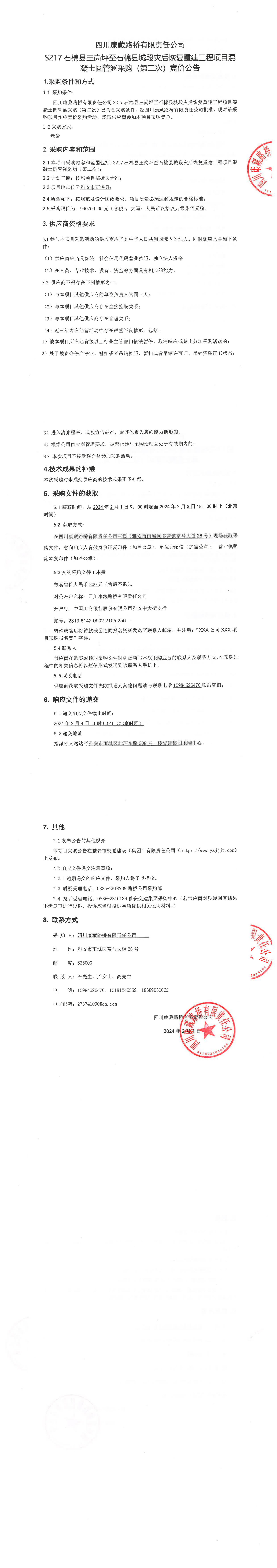四川康藏路橋有限責(zé)任公司S217石棉縣王崗坪至石棉縣城段災(zāi)后恢復(fù)重建工程項(xiàng)目混凝土圓管涵采購(gòu)(第二次)競(jìng)價(jià)公告