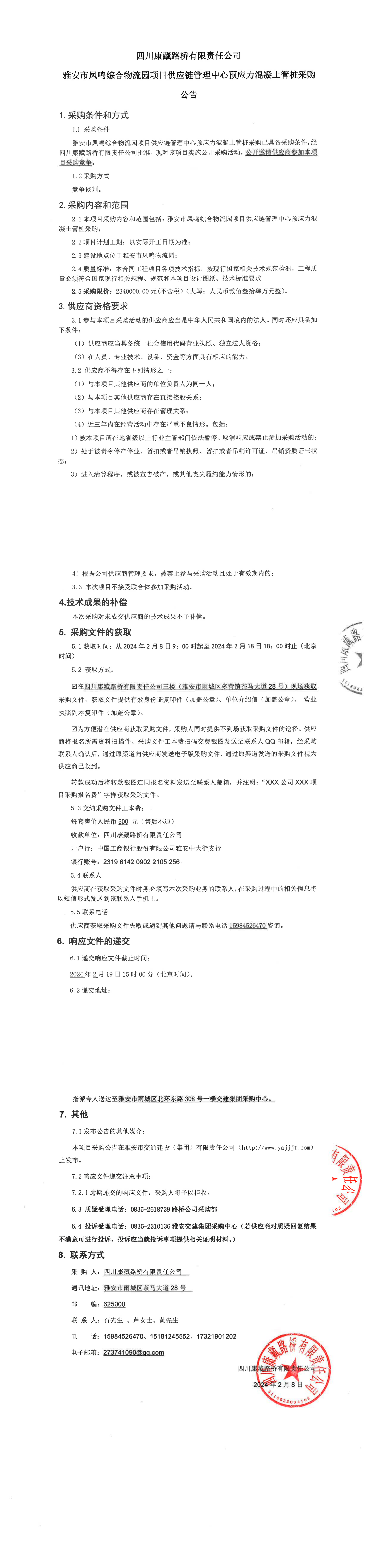 四川康藏路橋有限責(zé)任公司雅安市鳳鳴綜合物流園項(xiàng)目供應(yīng)鏈管理中心預(yù)應(yīng)力混凝土管樁采購公告