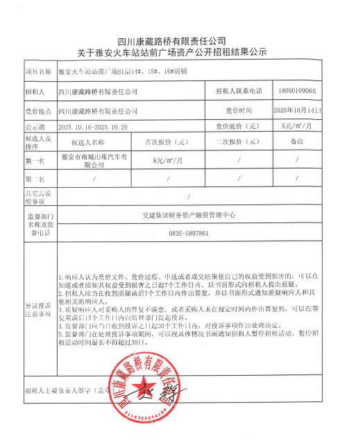 四川康藏路橋有限責任公司關于雅安火車站站前廣場資產公開招租結果公示