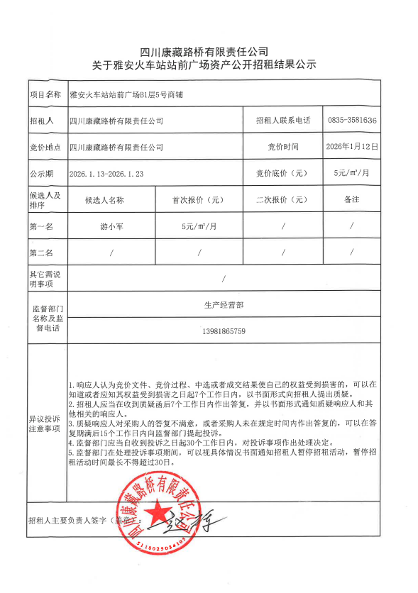 四川康藏路橋有限責(zé)任公司關(guān)于雅安火車站站前廣場(chǎng)資產(chǎn)公開招租結(jié)果公示