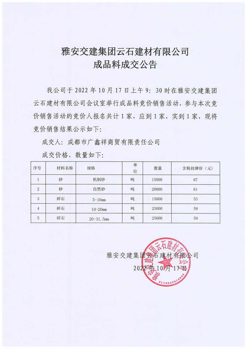 ÑŰ²½»½¨¼¯ˆFÔÆÊ¯½¨²ÄÓÐÏÞ¹«Ë¾³ÉÆ·Áϳɽ»¹«¸æ10.17