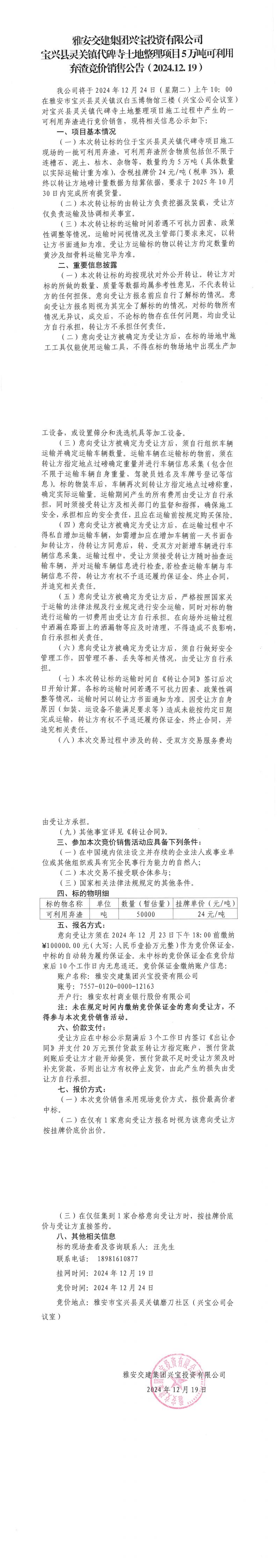 雅安交建集團(tuán)興寶投資有限公司靈關(guān)鎮(zhèn)代碑寺土地整理項(xiàng)目5萬(wàn)噸可利用棄渣競(jìng)價(jià)銷售公告(2024.12.19)